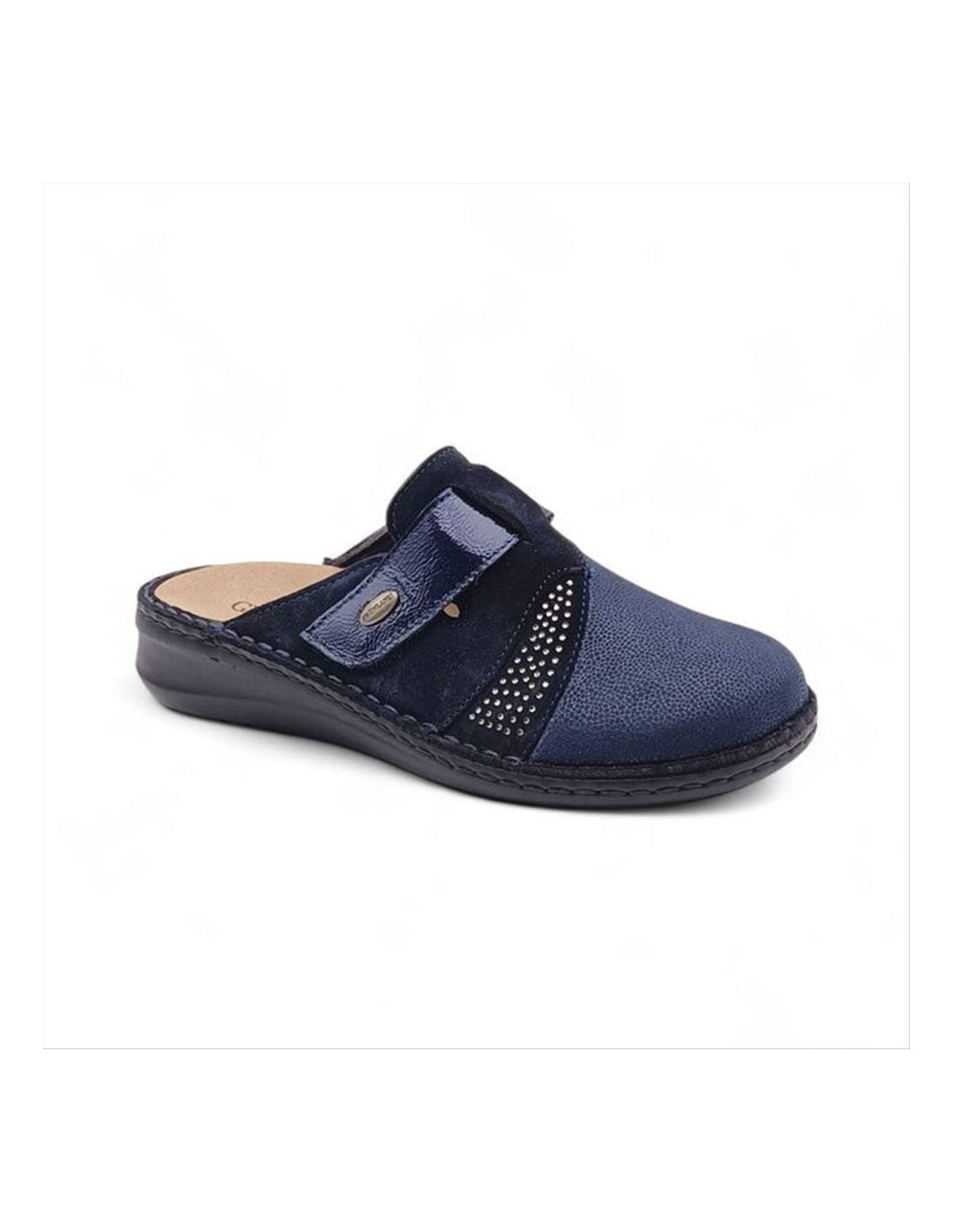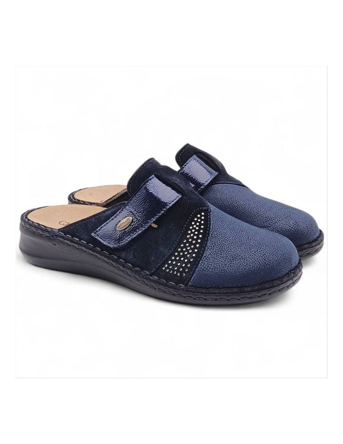 La tomaia in blu intenso è impreziosita da strass brillanti, che aggiungono un tocco glamour e raffinato alla calzatura. Un modello versatile, perfetto per chi desidera unire praticità e stile in una sola ciabatta.