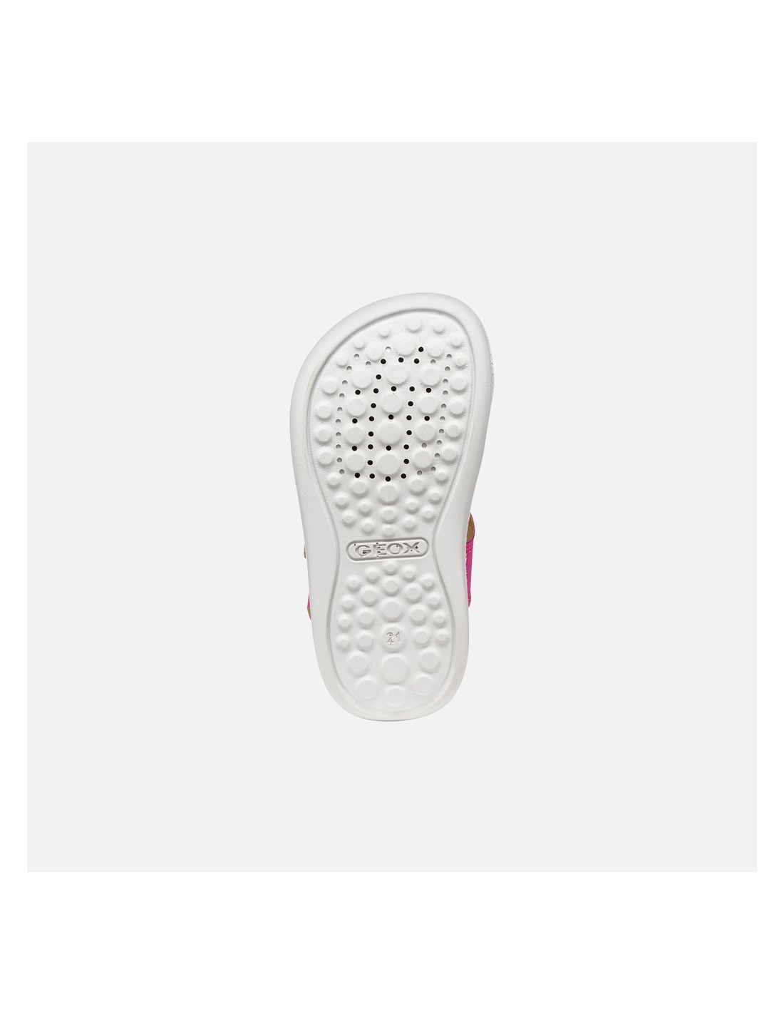 Il Geox Sandal Lightfloppy Fuchsia/White B455TB è un sandaletto da bambina pensato per offrire leggerezza, comfort e freschezza durante tutta la stagione estiva. Progettato dal rinomato marchio italiano Geox, questo modello combina funzionalità, qualità dei materiali e un design vivace perfetto per accompagnare le più piccole nelle giornate più dinamiche tra gioco, passeggiate e vacanze. Il sandalo si distingue per la brillante combinazione di colori Fuchsia e White, un mix vivace e femminile che dona energia e allegria al look estivo. Il fucsia intenso aggiunge un tocco di personalità, mentre il bianco crea un contrasto luminoso e versatile che rende la calzatura facilmente abbinabile a vestitini, shorts, leggings o outfit casual estivi. La struttura del sandaletto è progettata per garantire massima leggerezza e libertà di movimento, caratteristiche fondamentali per i bambini sempre in attività. La tomaia è realizzata con materiali resistenti ma morbidi, studiati per adattarsi al piede e offrire una calzata stabile e confortevole per tutta la giornata. Le chiusure regolabili con strappo permettono di indossare e togliere facilmente la scarpa, assicurando al tempo stesso una regolazione pratica e precisa che favorisce anche l’autonomia delle bambine. Uno degli elementi distintivi del modello è la tecnologia traspirante tipica delle calzature Geox, progettata per favorire la naturale traspirazione del piede e mantenere una sensazione di freschezza anche nelle giornate più calde. La suola leggera e flessibile garantisce inoltre una buona ammortizzazione e una presa sicura sul terreno, contribuendo a migliorare stabilità e comfort durante la camminata. Perfetto per la stagione estiva, il Geox Sandal Lightfloppy Fuchsia/White è ideale per accompagnare le bambine nelle attività quotidiane con il giusto equilibrio tra stile, praticità e benessere del piede. Una scelta versatile e affidabile per chi cerca un sandaletto fresco, resistente e colorato, capace di unire qualità e design in pieno stile Geox.