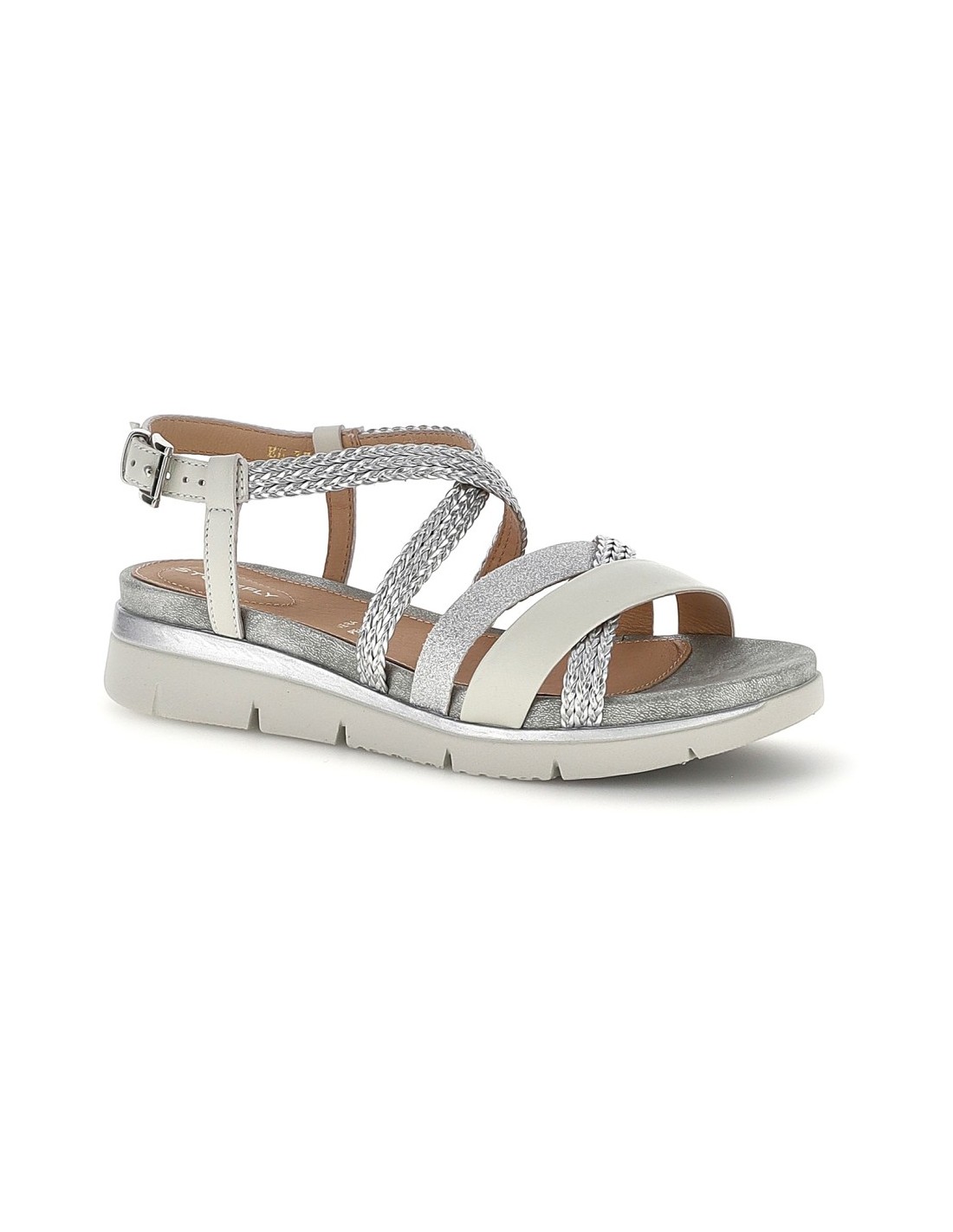 Realizzato con materiali di alta qualità, il sandalo presenta una struttura con fasce intrecciate che avvolgono delicatamente il piede, offrendo stabilità e un tocco di femminilità contemporanea. I dettagli glitter aggiungono un effetto luminoso e glamour, perfetto per valorizzare sia outfit casual che look più ricercati, rendendolo ideale per la stagione primavera-estate.