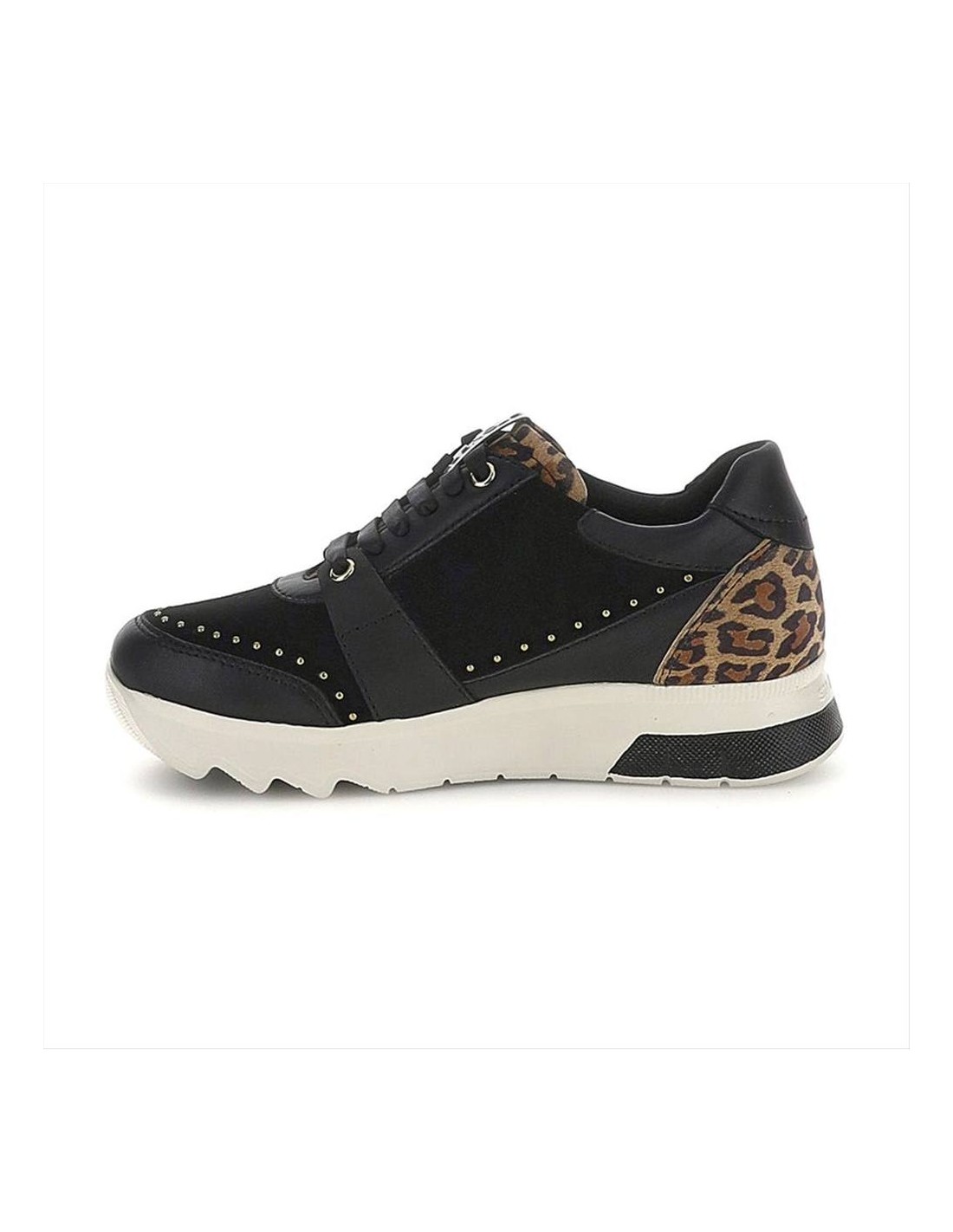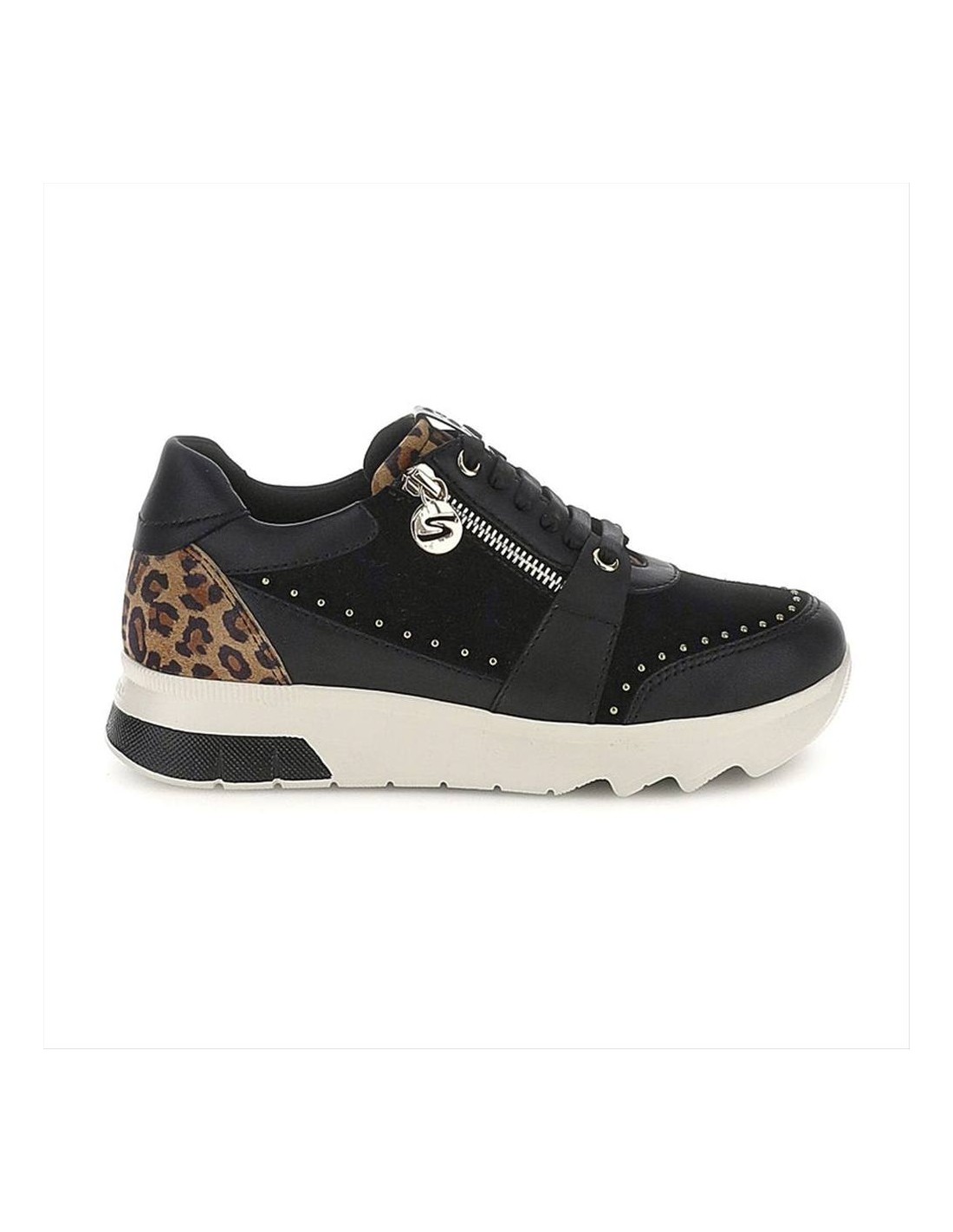 Il design nero è impreziosito da inserti animalier, che donano carattere e personalità alla scarpa, mentre la zip laterale funzionale rende la calzata semplice e veloce. Una sneaker pensata per chi vive la città con dinamismo e attenzione allo stile.