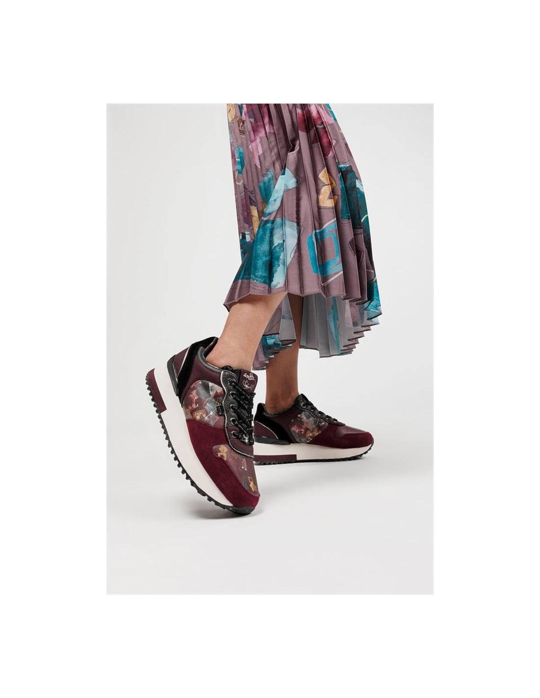 Il colore bordeaux intenso, elegante e di tendenza, rende queste sneakers perfette per la stagione autunnale e invernale, ma facilmente abbinabili anche a outfit casual di mezza stagione. I dettagli decorativi ispirati all’universo Anekke impreziosiscono la scarpa, trasformandola in un vero elemento distintivo del guardaroba.