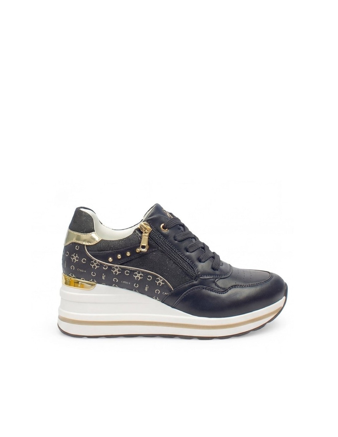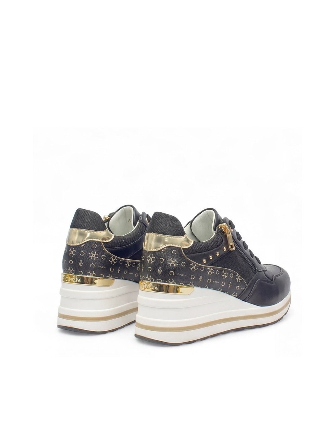 Il design contemporaneo valorizza la figura grazie alla zeppa interna che slancia la silhouette in modo naturale, offrendo al contempo comfort e stabilità durante tutta la giornata. La zip laterale aggiunge praticità e un tocco di modernità, rendendo facile indossare e togliere le sneakers in un attimo. Il modello white-gold dona un effetto luminoso e sofisticato, perfetto per outfit chiari o più ricercati, mentre il nero assicura versatilità e un look urbano sempre alla moda.